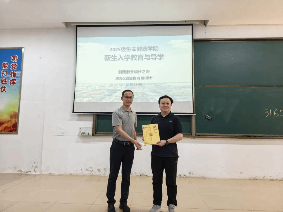 擎科生物上海基地总经理吕国强校友以 "生物产业发展现状" 为题,为新生们带来了一场生动的讲座。他从自己的求学经历讲起,分享了在校期间担任班长的经历,强调了学生工作对培养组织协调能力和沟通能力的重要性。他深入浅出地讲述了现代生物医药产业的发展现状与机遇,分析了大学生创业的路径和方法。结合擎科生物的发展历程,为新生们展示了生物产业的广阔前景,鼓励大家在大学期间打好专业基础,为未来的职业发展做好准备。