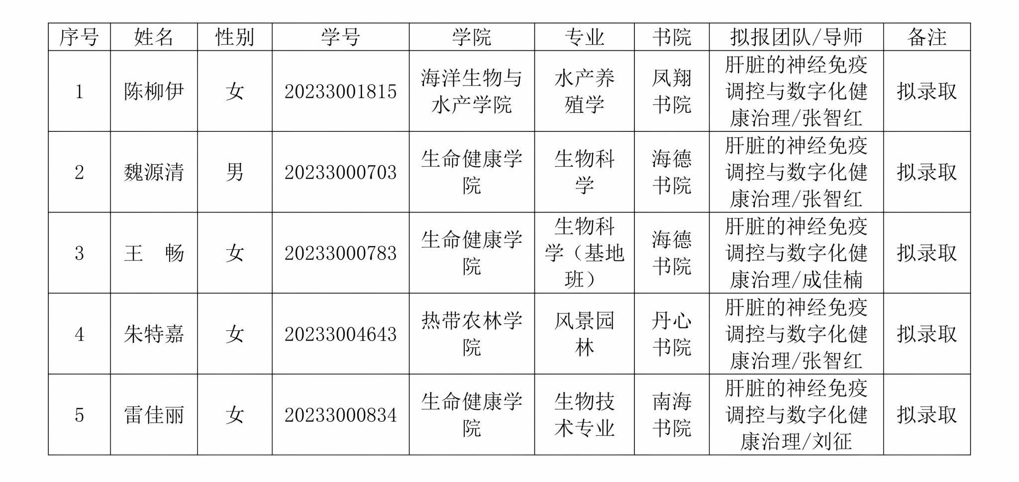 为全面系统深入推进学校“三大改革”,实施“一流本科教育全面提升计划”和“一流学科突破计划”,根据《海南大学拔尖创新人才培养实施方案》(海大党政办〔2025〕14号)和《海南大学本科拔尖创新人才培养暂行管理办法》(海大党政办〔2025〕32号)有关规定。经学生自愿报名,团队面试审核,5名学生入围,现将名单予以公示3个工作日。