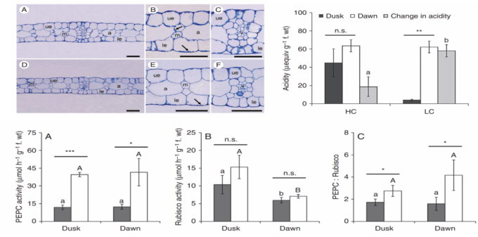 代表性成果一:发现龙舌草中C4、CAM、HCO3- 利用这三种无机碳利用策略共存,可能单个细胞就可以完成 C4 光合途径。