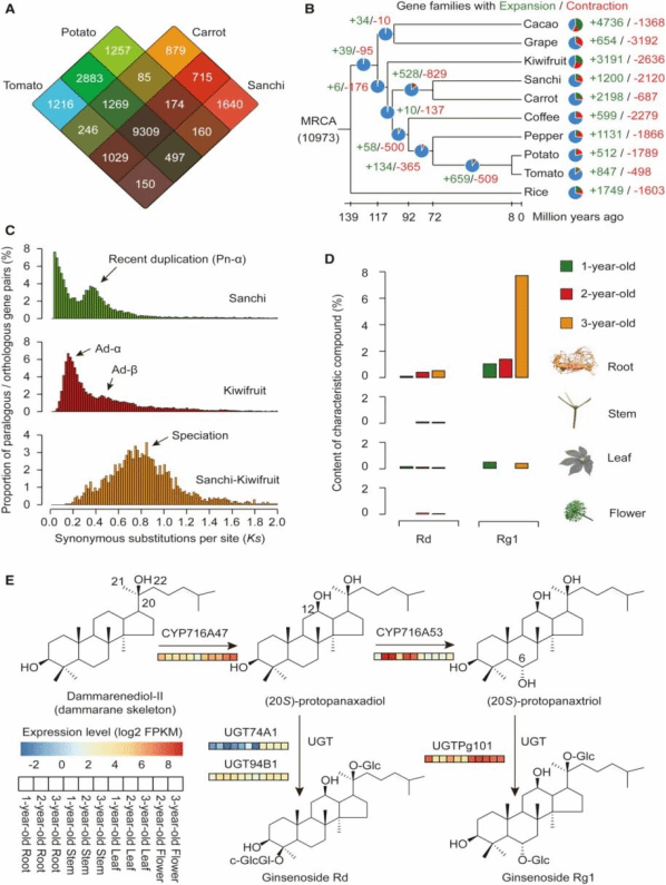 代表性成果三:克服了高重复、高杂合度的困难,完成了三七基因组从头组装并获得较高质量的基因组参考序列,是首个三七基因组草图;研究发现三七经历了一系列的基因组进化事件造就了这一著名的草本药用植物独特的药性。