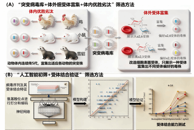 图2:两种评估禽流感病毒跨种传播风险的高通量新方法示意图