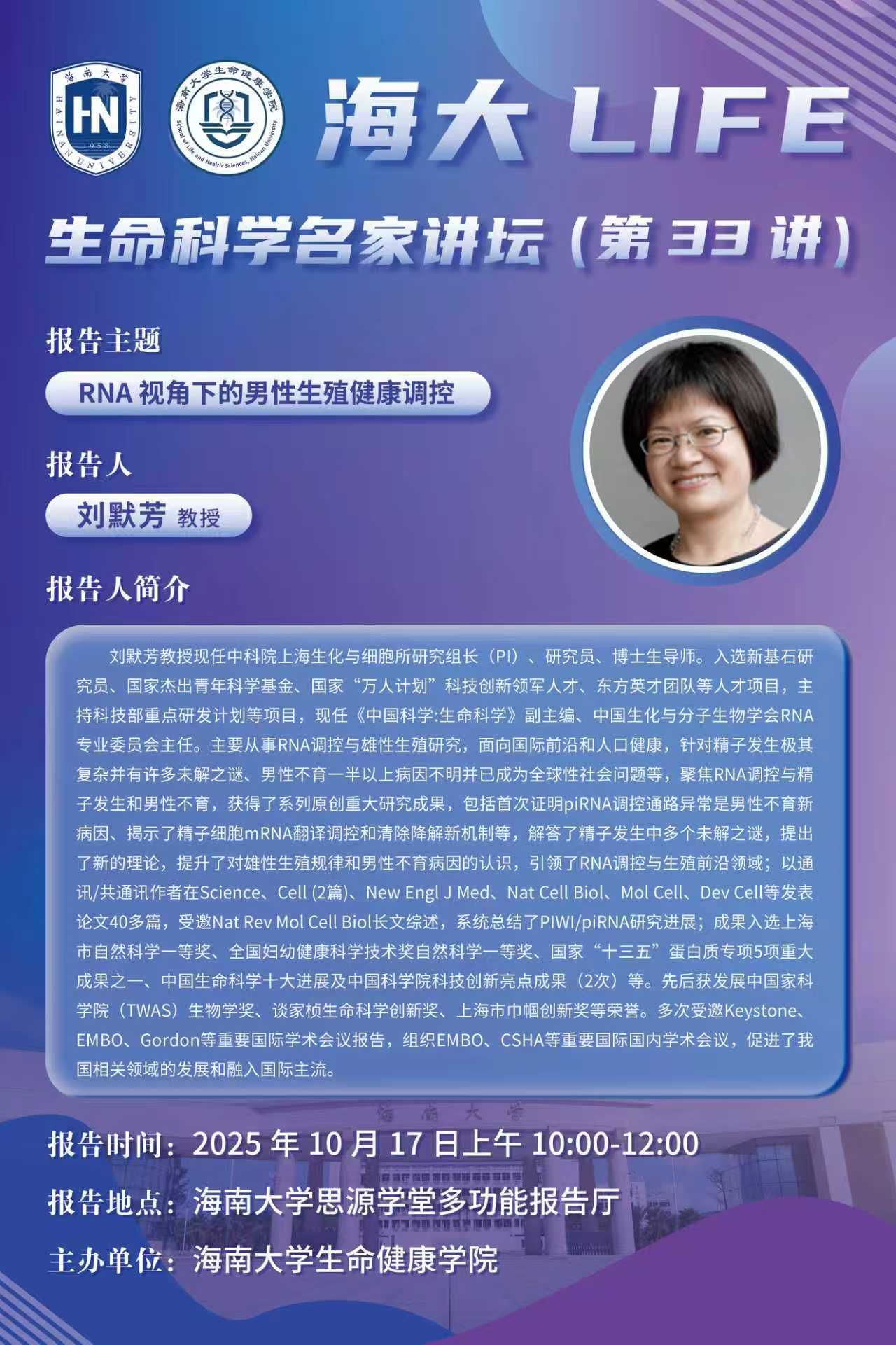 海大LIFE-生命科学名家讲坛(第33讲)| 刘默芳:RNA 视角下的男性生殖健康调控
