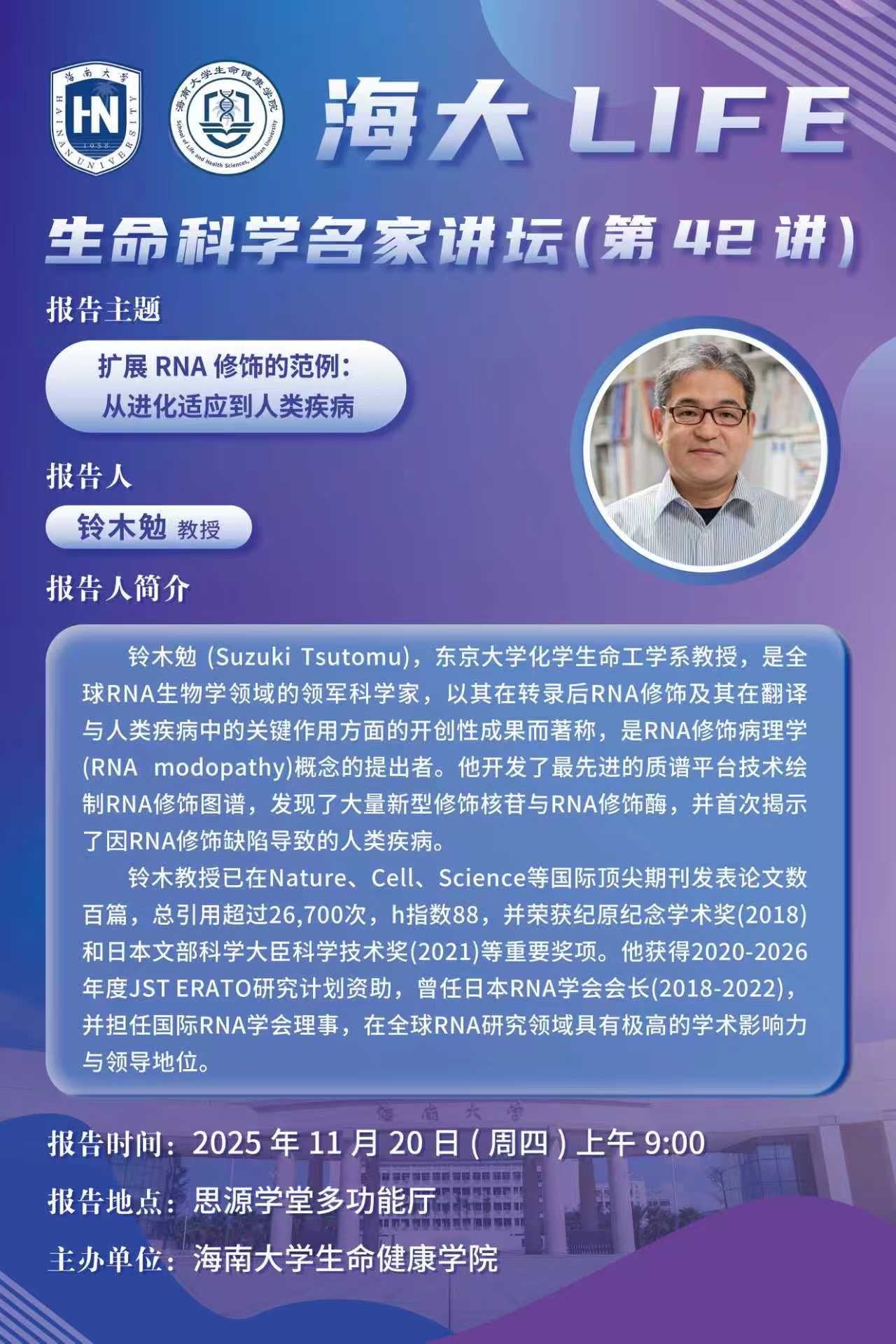 海大LIFE-生命科学名家讲坛(第42讲)| 铃木勉:扩展 RNA 修饰的范例:从进化适应到人类疾病