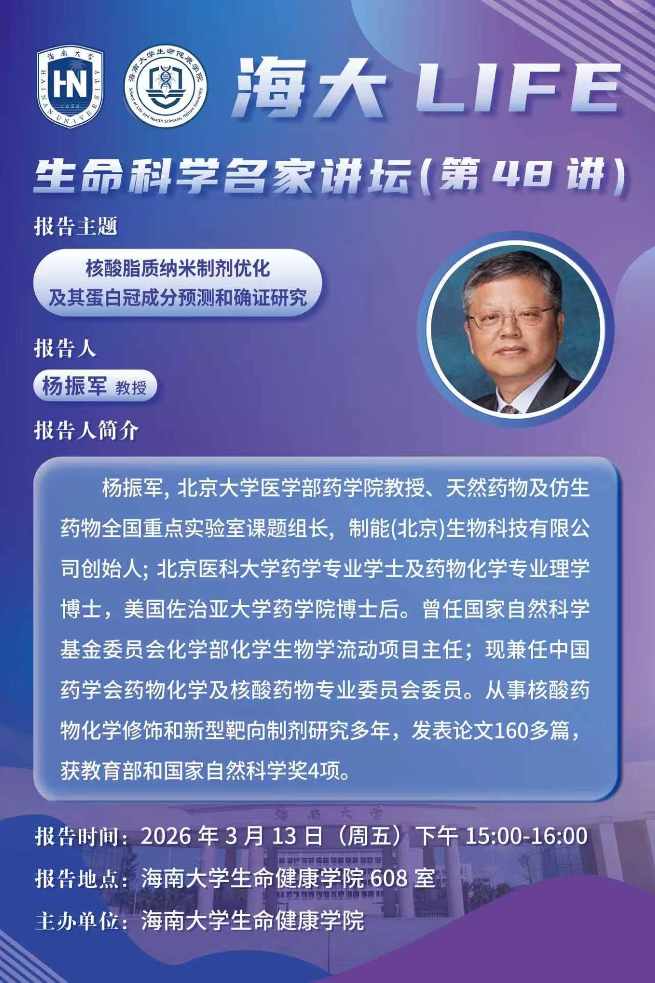 海大LIFE-生命科学名家讲坛(第48讲)| 杨振军:核酸脂质纳米制剂优化及其蛋白冠成分预测和确证研究
